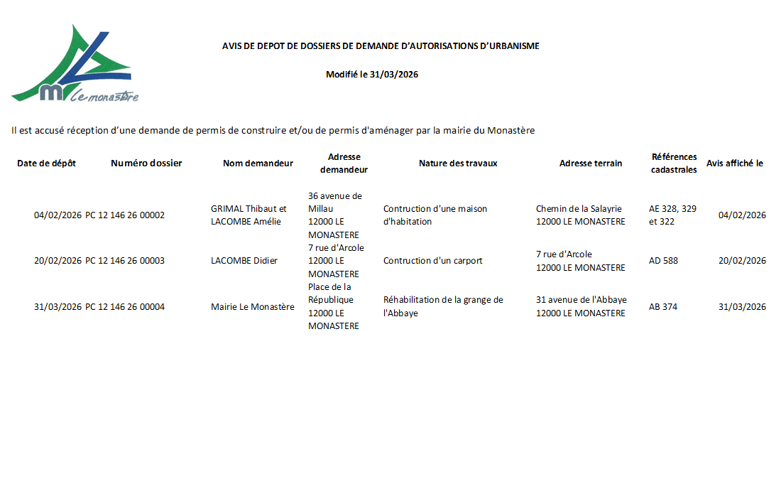 Avis de dépôts de dossiers permis de construire/permis d'aménager