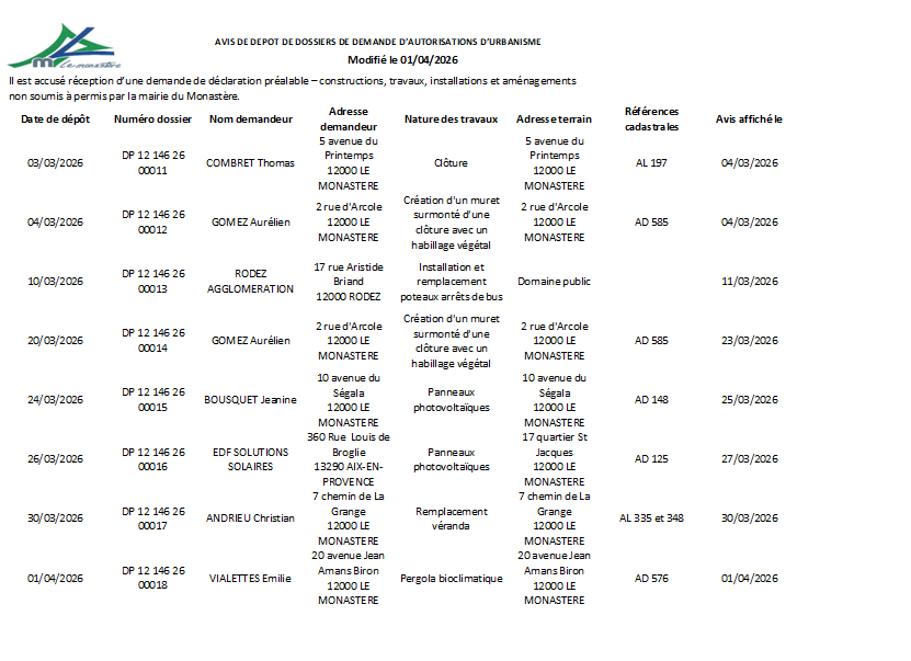 AVIS DE DÉPÔTS DE DOSSIERS DECLARATION PRÉALABLE DE TRAVAUX